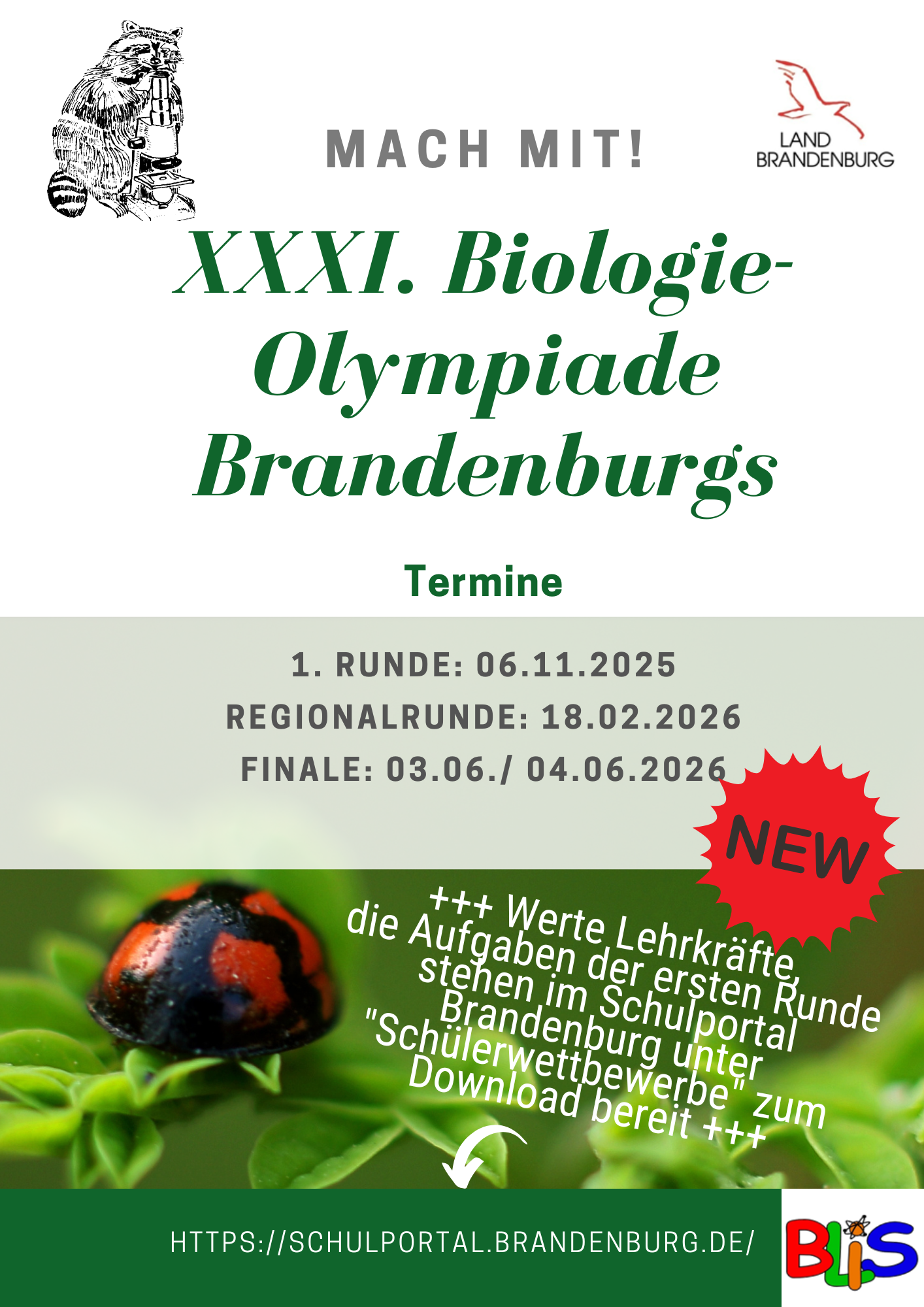 Die Termine der diesjährigen Landesolympiade Biologie finden Sie hier auf einen Blick. Die Aufgaben für die erste Runde stehen den teilnehmenden Schulen ab zwei Wochen vor den Herbstferien im Schulportal Brandenburg unter dem Menüpunkt „Schülerwettbewerbe“ zur Verfügung.